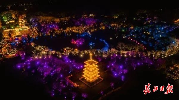 自3日夜赏樱花模式开启后,更多游玩体验被解锁。记者现场看到,夜色下的东湖樱花园别有一番风味。借助无人机鹰眼俯视,423亩的东湖樱花园犹如一大块天然水晶,璀璨缤纷的小水晶镶嵌其中,闪着或蓝、或紫、或红、或橙的光芒。五重塔静静矗立,描金勾勒出东湖樱花园最亮眼的部分。灯光一亮,白天内敛典雅的曲院樱艳张扬了起来,翘角上的红色灯笼在粉色樱花的掩映下更显东方韵味,池塘中央的仙鹤展翅欲飞,一侧的画舫也在夜幕中十分亮眼。