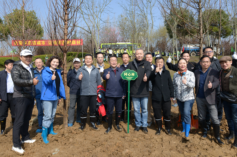 武汉市委台办主任刘红鸣带领全体机关干部和市台商企业协会台胞代表,与硚口区干部群众一道,填土、围堰、浇水、松绑,共同种下了近百株水杉“同心林”,为美丽武汉增添新绿。