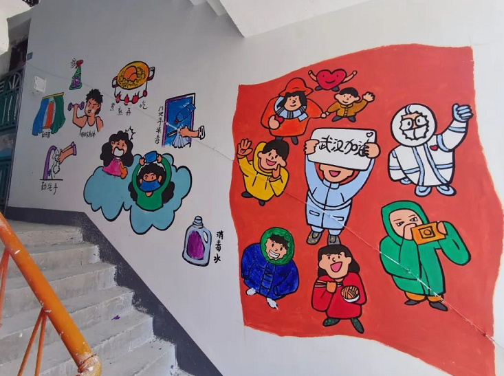 绘画中,孩子们眼中的英雄的武汉、可爱的中国、武汉地标美景及文明行为规范等四大类主题醒目突出。在楼道栏杆横梁上,还写有告诫制“癣”者的“我是一面漂亮的墙,别往我身上乱贴乱画哟!”等提示语。