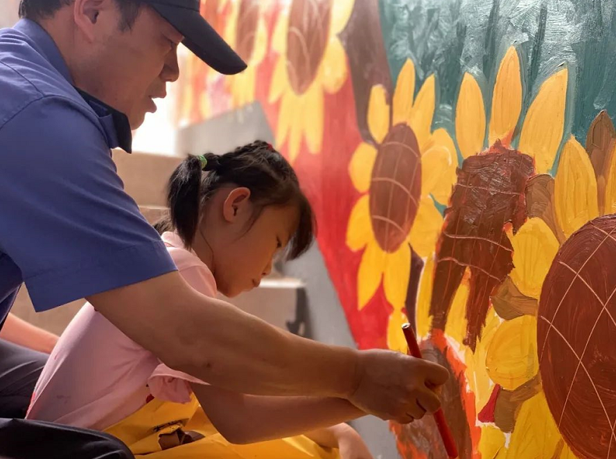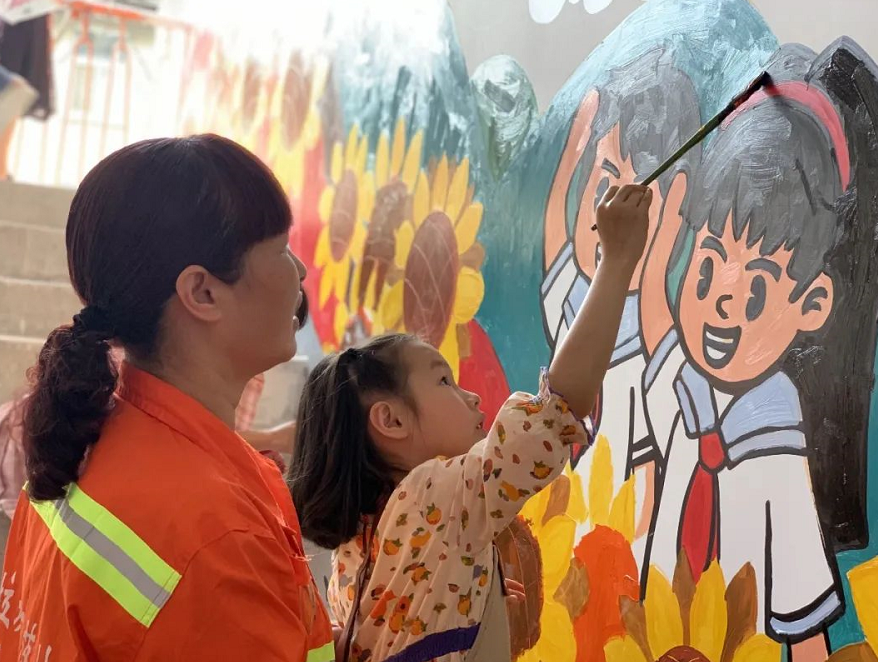 迎接“六一”国际儿童节,5月30日,硚口区易家街道工农路社区一处老旧小区来了一群美术班的小朋友,他们在楼道作画,美化了小区,扮靓了家园。