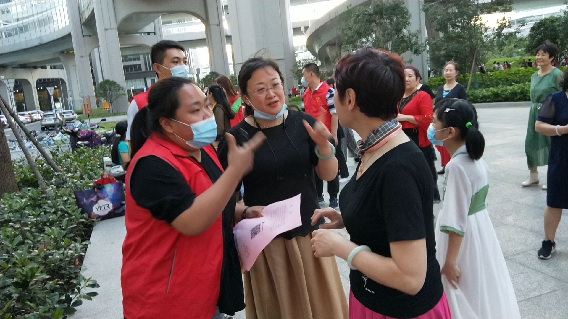 葛洲坝社区工作人员和下沉党员为广场舞成员发放“静音”通知。 通讯员供图
