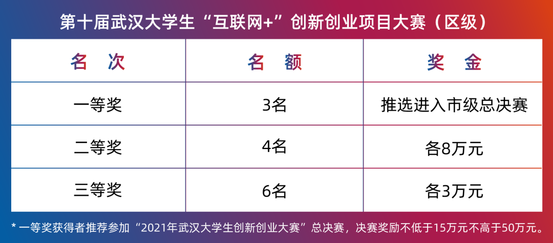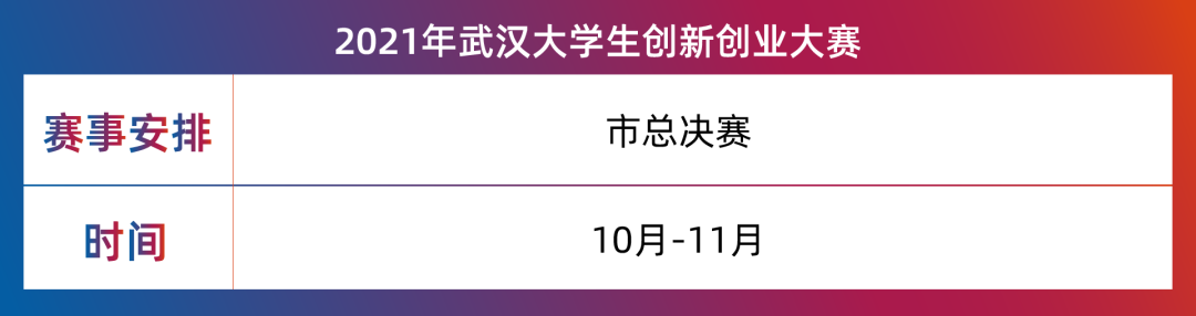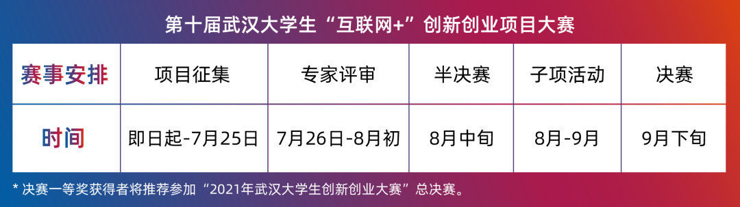 大赛包括第十届武汉大学生“互联网+”创新创业项目大赛、2021年武汉大学生创新创业大赛两大主体赛事及子项活动,具体赛事安排如下:
