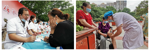 区卫生健康局、荣华街社区卫生服务中心邀请华中科技大学同济医学院附属同济医院、武汉市第一医院、湖北省第三人民医院的中医专家,与硚口青年中医传承人在硚口公园组团“摆摊”,为居民拿脉、艾灸、拔火罐,贴三伏贴。