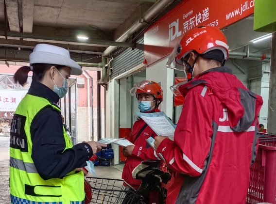 在位于古田四路的京东快递网点,硚口交警隔三差五带着“礼品”——电动自行车交通秩序宣传画册,上门进行宣传督导。