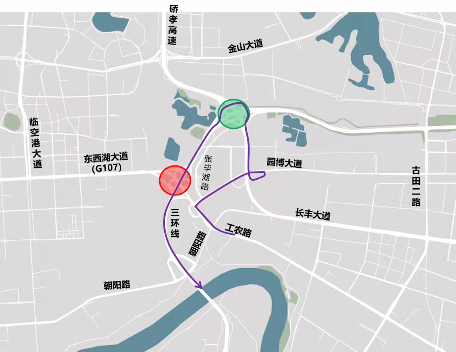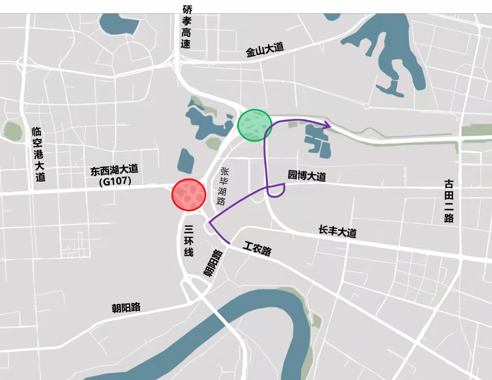 绕行线路2:朝阳路、临空港大道(限高3.9米),或绕行张毕湖路、园博大道、工农路。