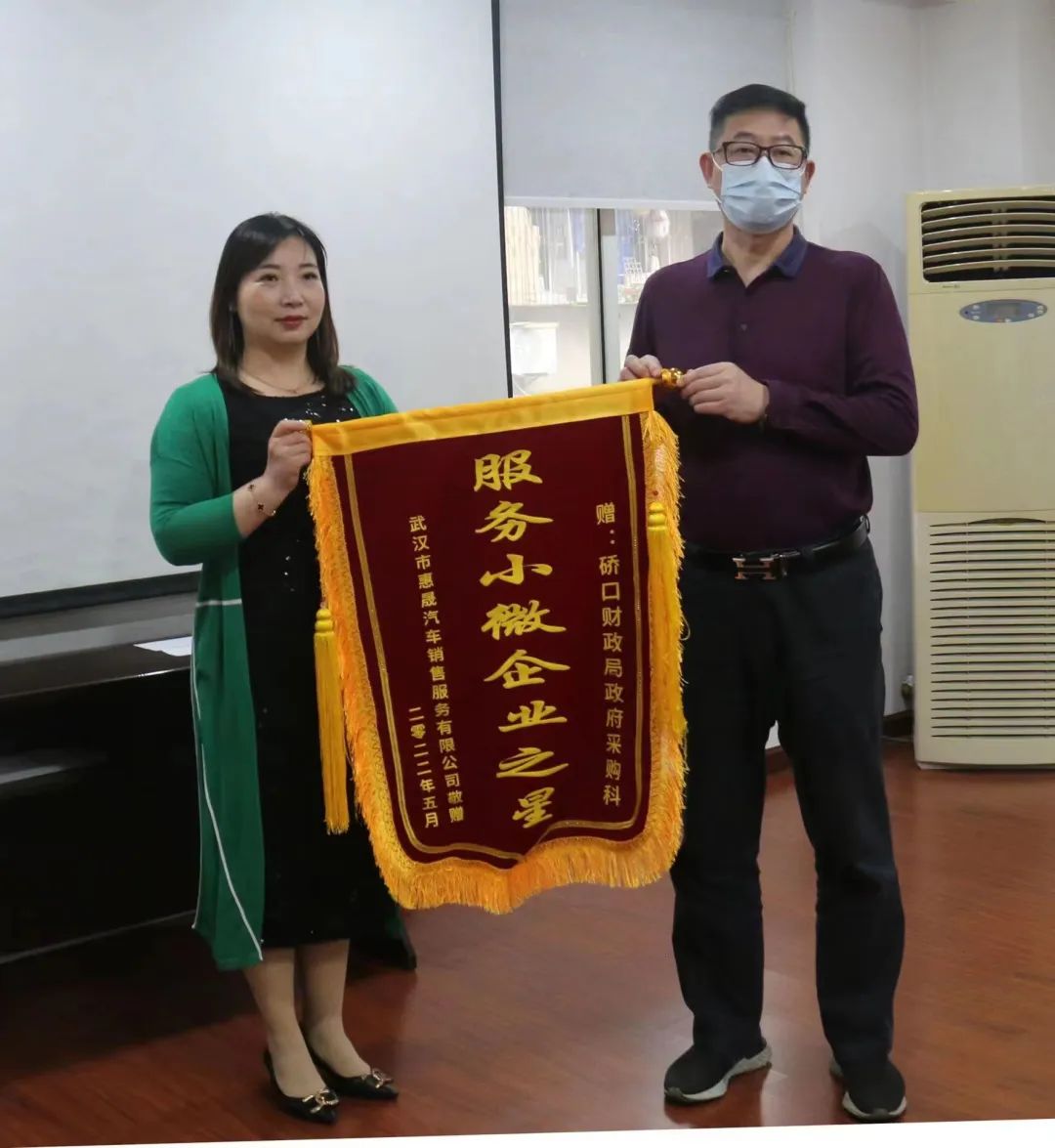 近日,武汉市惠晟汽车销售服务有限公司负责人将一面写有“服务小微企业之星”的锦旗和感谢信送至硚口区财政局。目前,该局共帮助5家企业成功入驻政府采购电子商城,做好服务企业“店小二”。