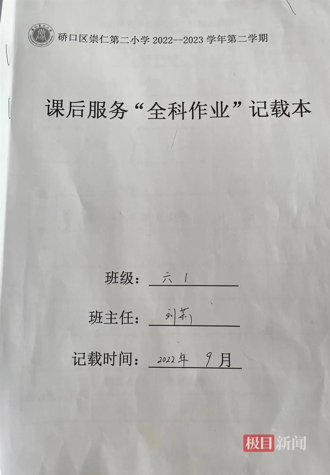刘莉老师展示的班级“全科作业本”上,详细记载着每天各类型作业的具体内容和预计时长,每页最后是完成情况的反馈。