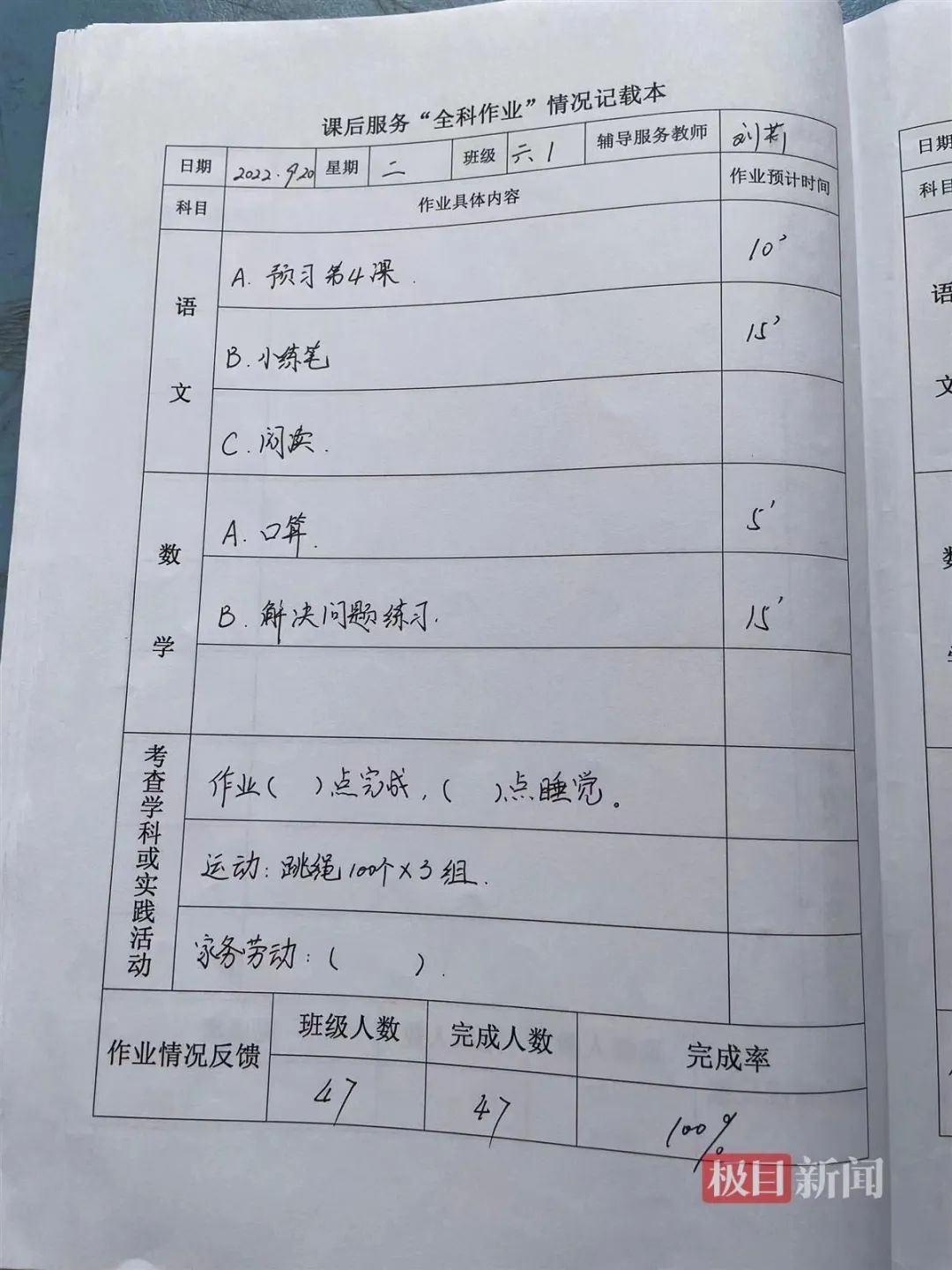 每天的课后服务时间,值班老师会对照“全科作业本”内容,辅导学生完成作业,并统计上报在校完成作业的人数和比例。“90%以上的学生能够在课后服务时间完成书面作业,个别拖延的学生,班主任会及时了解并帮学生分析原因。”刘老师说。