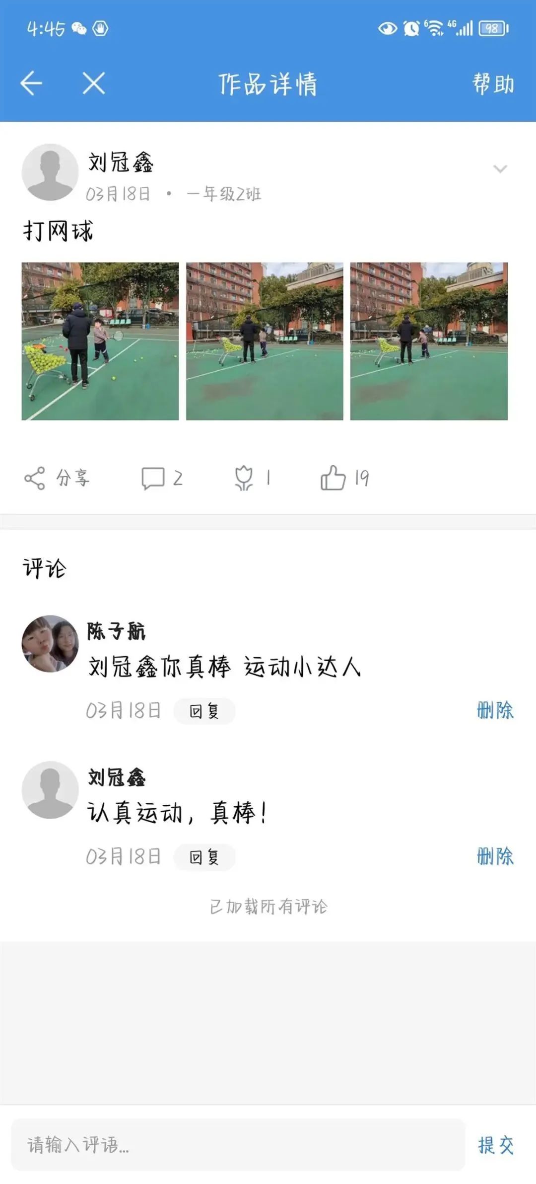 每月,学校会在升旗仪式上对学生的体育家庭作业效果进行评估、表彰先进,颁发“红领巾争章”之“健体章”。一学期来,参与活动的人次达1096人,收到体育锻炼作品9553件,体育锻炼视频浏览量达29929次。家庭体育作业,帮助学生培养运动兴趣,养成运动习惯。