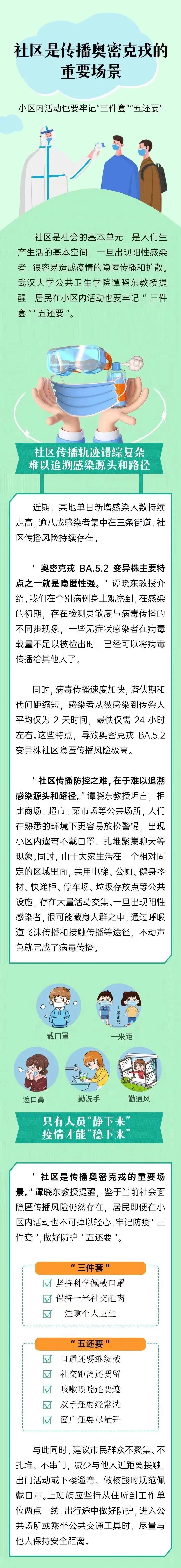 社区是社会的基本单元,是人们生产生活的基本空间,一旦出现阳性感染者,很容易造成疫情的隐匿传播和扩散。武汉大学公共卫生学院谭晓东教授提醒,居民在小区内活动也要牢记“三件套”“五还要”。