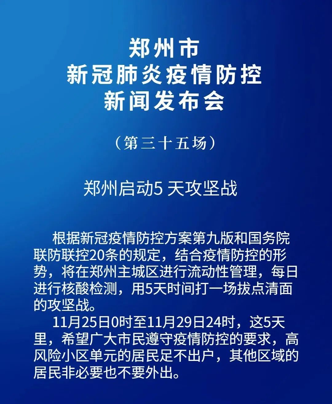 根据《新型冠状病毒肺炎防控方案 (第九版)》、《关于进一步优化新冠肺炎疫情防控措施科学精准做好防控工作的通知》(联防联控机制综发[2022]101号)规定,结合郑州疫情防控形势,郑州市将在11月25日零时到11月29日24时,用5天时间打一场疫情防控歼灭战。