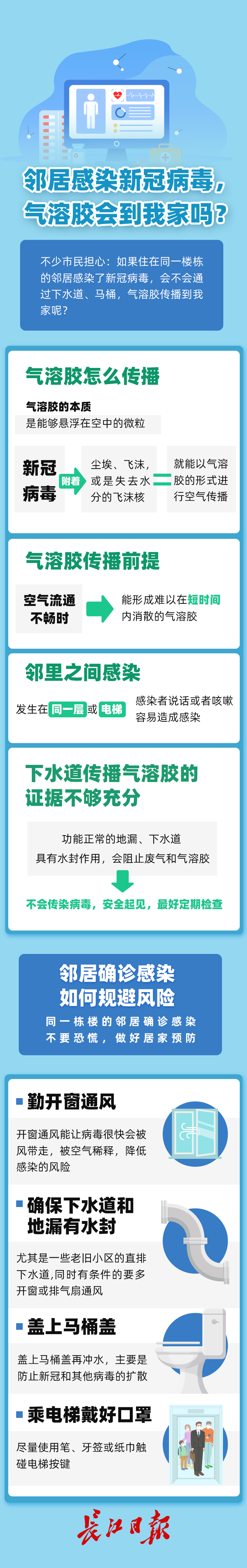 邻居感染新冠病毒,气溶胶会到我家吗? 2022-12-12 10:22 长江日报 0 同一楼栋的邻居感染了新冠病毒 会不会通过下水道、马桶 气溶胶传播到我家呢? 如何规避这一风险? 对此,长江日报记者采访了 武汉市第三医院首义院区 呼吸与危重症医学科副主任医师鲍敏 为大家释疑解惑