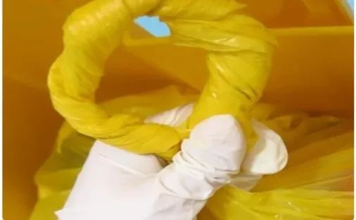 当盛装的医疗废物达到包装物或者容器的3/4时,可以采用这种有效的封口方式,家里的普通垃圾袋也适用。