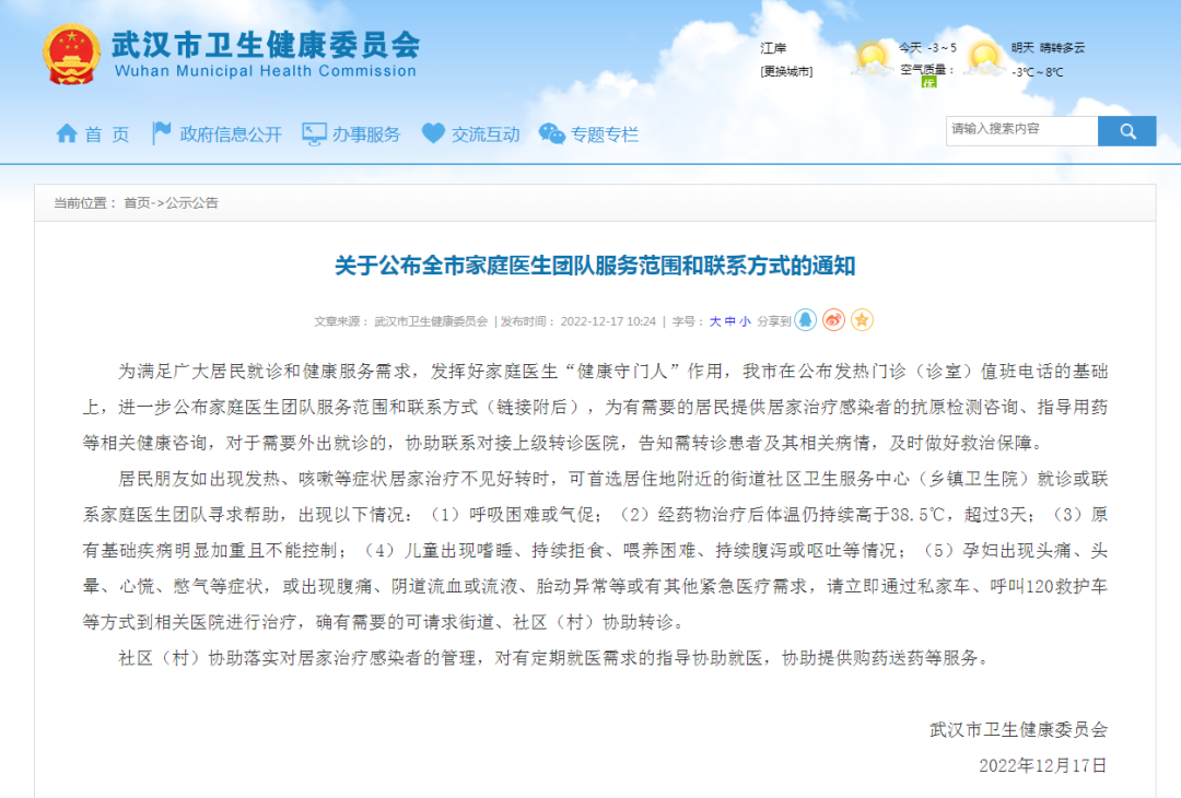 为满足广大居民就诊和健康服务需求,发挥好家庭医生“健康守门人”作用,我市在公布发热门诊(诊室)值班电话的基础上,进一步公布家庭医生团队服务范围和联系方式(链接附后),为有需要的居民提供居家治疗感染者的抗原检测咨询、指导用药等相关健康咨询,对于需要外出就诊的,协助联系对接上级转诊医院,告知需转诊患者及其相关病情,及时做好救治保障。