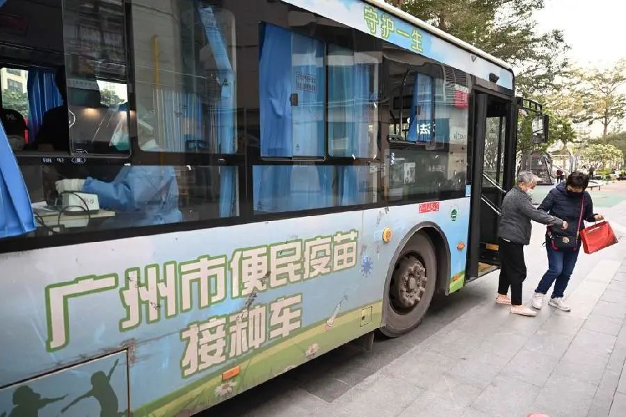 12月12日,在广州市荔湾区广钢新城,老年居民在接种新冠疫苗后走下便民接种车。新华社记者 邓华 摄