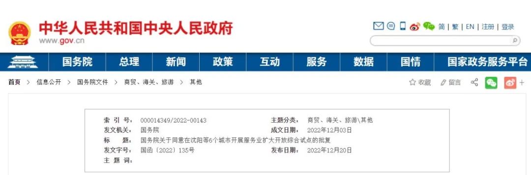 12月20日,中国政府网公布《国务院关于同意在沈阳等6个城市开展服务业扩大开放综合试点的批复》,同意在武汉市、广州市、成都市、南京市、杭州市、沈阳市开展服务业扩大开放综合试点,试点期为自批复之日起3年。