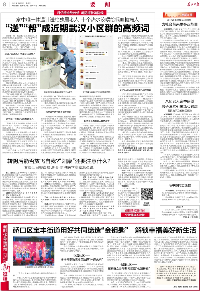 今年以来,硚口区宝丰街道积极开展美好环境与幸福生活共同缔造活动。建立完善全覆盖的基层党组织。加快老旧小区综合整治,提高群众居住质量。聚集多方力量,解决群众急难愁盼大小事,不断满足人民群众日益增长的美好生活需要。