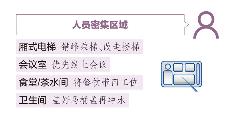 北京疾控提醒,安全返岗还应保持办公场所空气流通;保持环境卫生清洁;安全就餐,分散就座、不扎堆,不聊天,避免面对面;