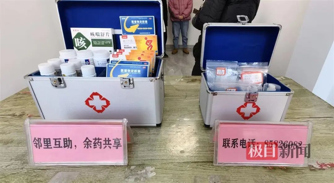 除此之外,共享药箱内还装有抗原试剂盒、体温计、消毒酒精、咳喘舒片、甘草片、氯雷他定等药品。两个药箱前,摆放着“邻里互助,余药共享”的字样和取药联系电话。