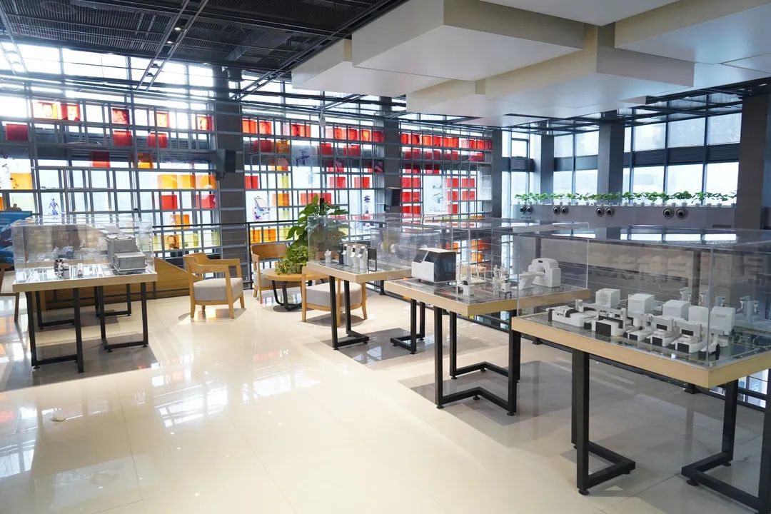 走进D+M,映入眼帘的是大片的彩色玻璃和一级级木质台阶,沿着台阶走到头,便来到了D+M智造体验中心及供应链整合服务平台。D+M智造体验中心及供应链整合服务平台是D+M小镇公共服务平台之一,是一个以工业设计来推动产业创新、科技成果转化、创新创业发展的成果展示馆。