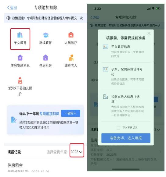 进入填报界面,选择“子女教育”,选择扣除年度“2023”,再将相关信息录入即可。