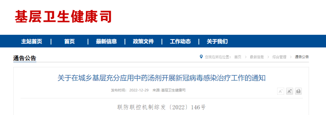 12月29日,国家卫健委网站发布《关于在城乡基层充分应用中药汤剂开展新冠病毒感染治疗工作的通知》,其中提出: