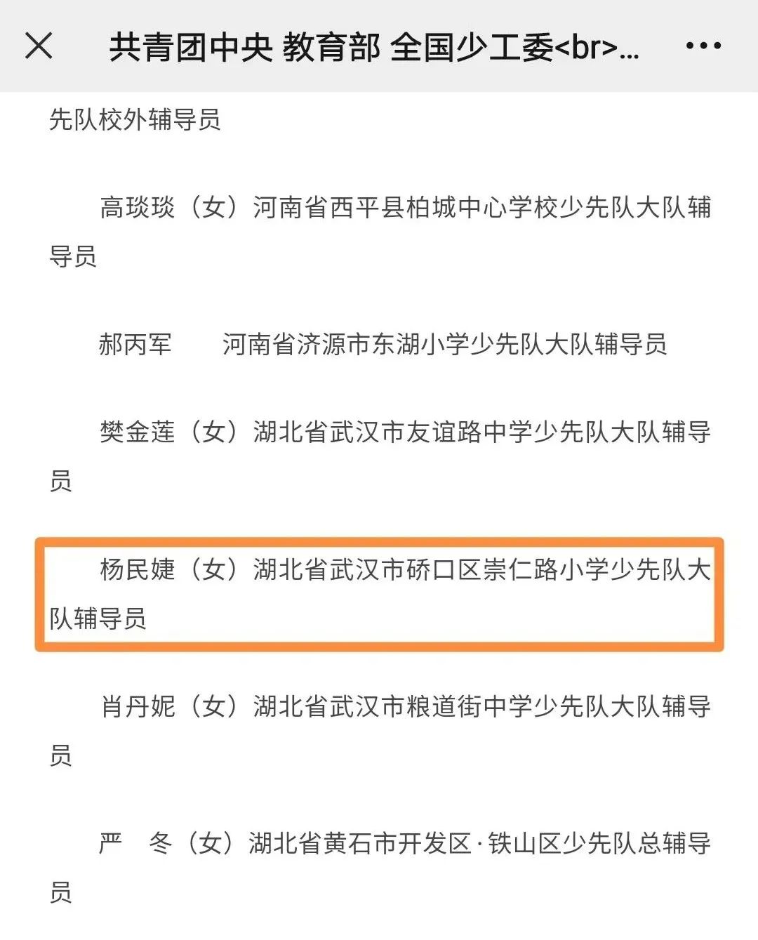 近日共青团中央、教育部、全国少工委发布《关于表彰2022年度全国优秀少先队员、全国优秀少先队辅导员、全国优秀少先队集体的决定》其中武汉市硚口区崇仁路小学少先队大队辅导员杨民婕光荣上榜获评2022年度全国优秀少先队辅导员