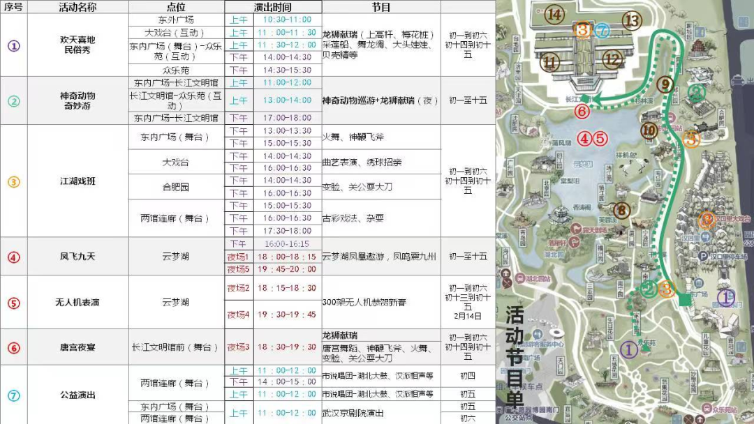 活动内容:传统民俗舞龙舞狮表演、湖北新春民俗采莲船、蚌壳精、绸舞、大头娃娃闹新春、生肖动物巡游等。