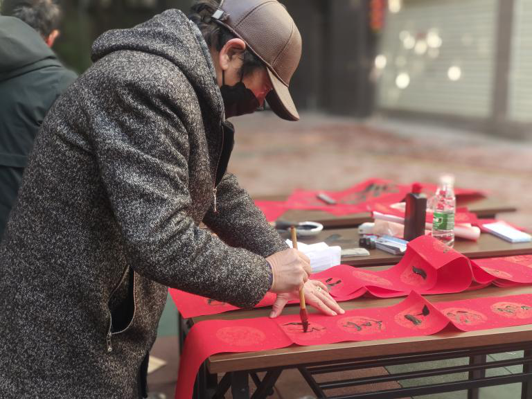 在新华社区新华宿舍“瑞兔呈祥 喜迎新年”主题活动上,居民朋友们“提笔临福,大家有序挑选自己喜欢的“福”字,纷纷将幸“福”带回家。