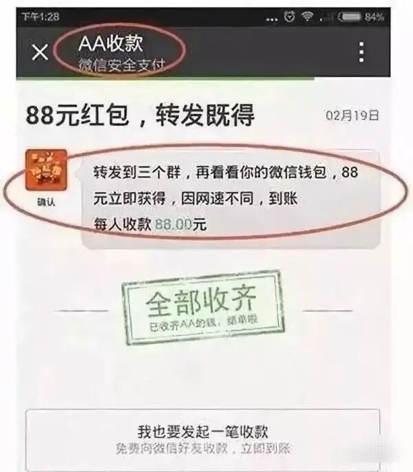 警惕写着“送钱”“现金礼包”“AA红包”等字样的红包骗局。此类红包往往对微信AA收款界面进行略微改动,加上“送钱”“现金礼包”等字样,让用户误以为输入密码是在领红包,但实际上却是给对方转账 。