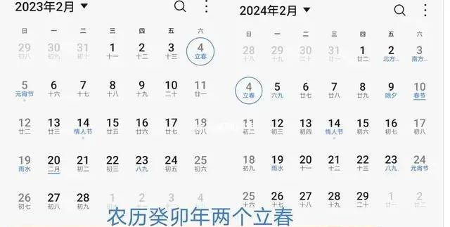 2023年是癸卯年(兔年),闰二月,农历全年有384天,年首年尾各有一个立春,故称双春年。第一个立春日是在农历癸卯年的正月十四日;第二个立春日则是在农历癸卯年的腊月二十五。