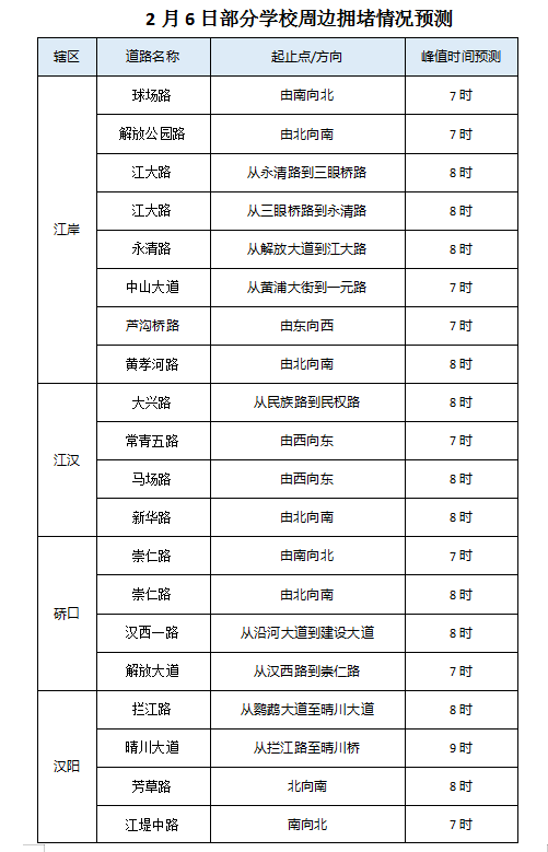 学校周边道路拥堵将上升得更为明显,部分道路拥堵高峰提前至7时。预计江岸区的永清片区、花桥片区、武昌的中南片区以及汉阳、洪山等部分学校因驾车送学车流较多,周边拥堵延时指数增幅较大。学校周边的部分道路如拦江路、虎泉街、天鹅路、芦沟桥路、惠明路、博学路等路段因送学车辆猛增,在开学当天早高峰拥堵程度为普通工作日的2倍左右。