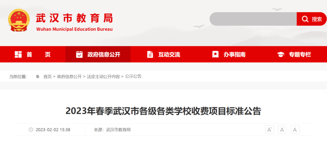 2月3日,武汉市教育局、市发展和改革委员会联合发布《2023年春季武汉市各级各类学校收费项目标准公告》。