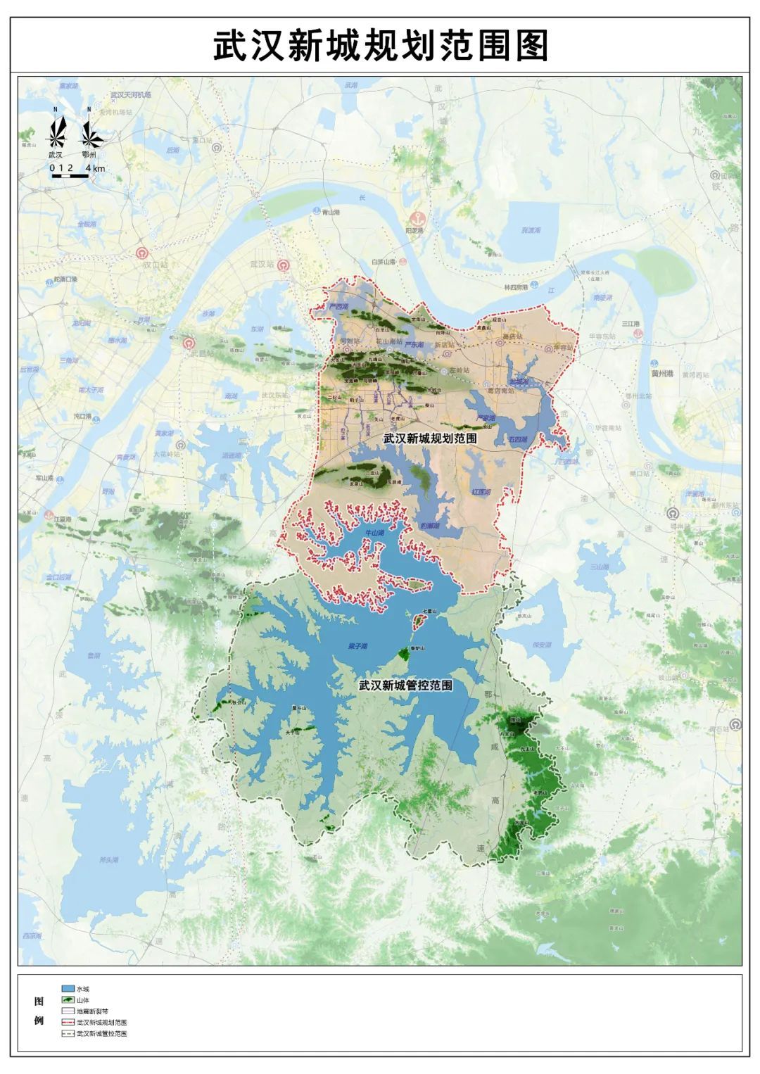 武汉新城规划范围东至鄂咸高速,南至梁子湖,西至京广铁路,北至长江南岸,规划面积约719平方公里;武汉新城管控范围拓展至环梁子湖区域,规划面积约1689平方公里。