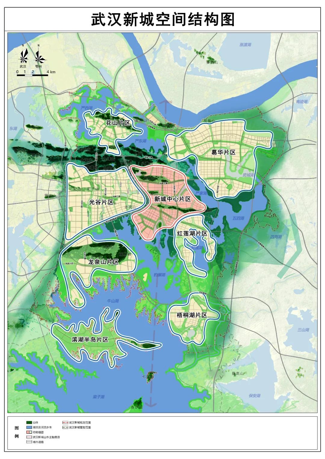 按照“山水城、家园城、智慧城”三大目标,构建山湖相映、组团发展的空间结构,划分新城中心片区、光谷片区、葛华片区、花山片区、龙泉山片区、红莲湖片区、梧桐湖片区、滨湖半岛片区共8大片区,形成产城融合、功能复合的空间布局。