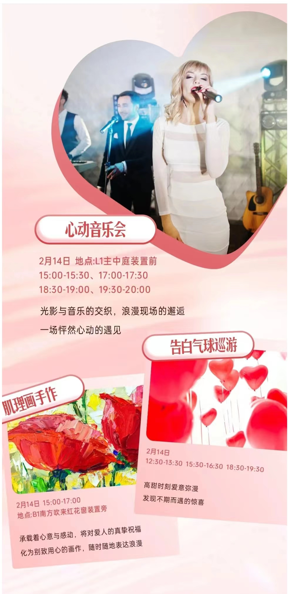 爱在眼神中传递,在歌声中共鸣,心动音乐会唤醒热情,再现怦然心动;遇见“告白气球巡游”的队伍,爱意从心出发,心意永存;因爱携手,将想象化为现实,肌理画手作留下旅程中值得纪念的时光。