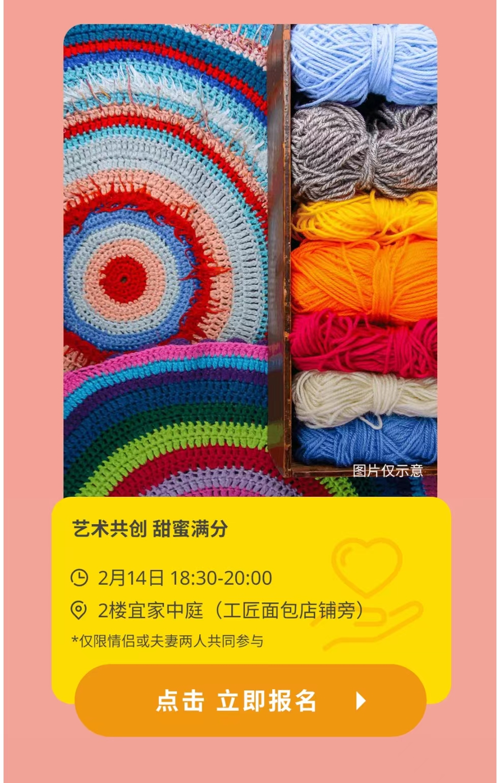 情人节当天,宜家中庭的艺术共创装置变身为浪漫指数爆表的打卡地,快来体验情侣的甜蜜新玩法,签到领取号码牌和彩色毛毡条,感受属于情人节的心动时刻,参与活动有机会获得电影票两张噢~