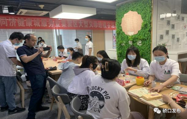 硚口同济健康城服务业集聚区综合党委联合硚口区卫生健康局、宝丰街道卫生服务中心,在集聚区江城红领驿站 党群活动服务中心举办“党建引领、融合赋能”——大型义诊进楼宇活动。针对上班族外卖点餐、办公室久坐缺乏锻炼导致的亚健康状况,来自同济医院、湖北省第三人民医院、社区卫生服务中心的医生分别就西医、中医、康复等多学科提供咨询,进行面对面交流。