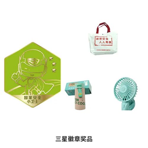 (3)点亮5个基地,可获得“三星安全小卫士”电子荣誉徽章,可兑换国家安全宣传品1份(帆布袋,迷你保温杯、小风扇,共计500份);