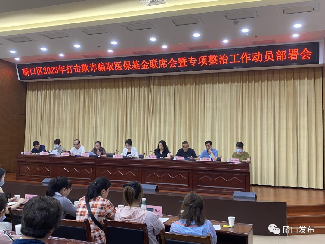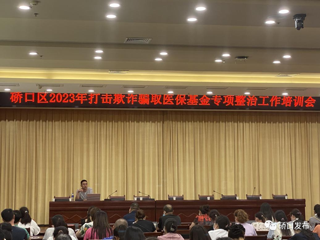 近日,硚口区召开2023年打击欺诈骗取医保基金联席会暨专项整治工作部署培训会,区政府副区长孙嘉出席会议并讲话。区医保局传达市医保局、检察院、公安局、财政局、卫健委五部门联合下发《武汉市2023年医保领域打击欺诈骗保专项治理工作方案》,通报硚口区2023年医保领域打击欺诈骗保专项整治自查工作情况;区纪委监委、区检察院、硚口公安分局、区卫健局分别提工作要求,全区400余家医保定点医药机构负责人参会。