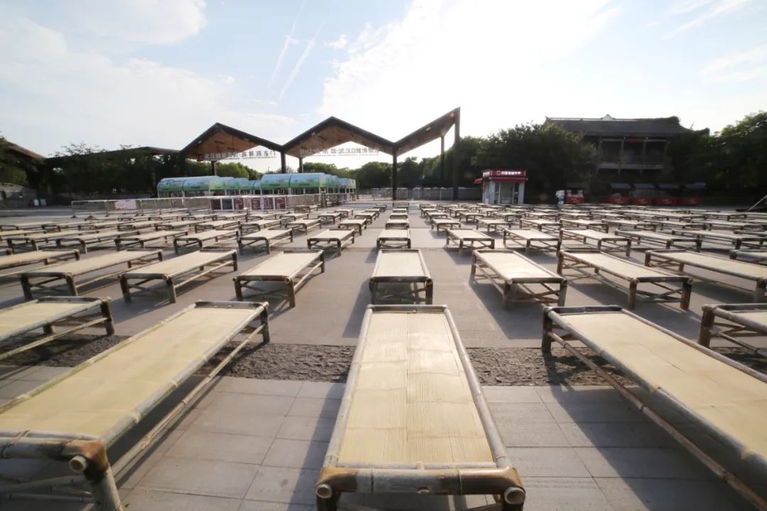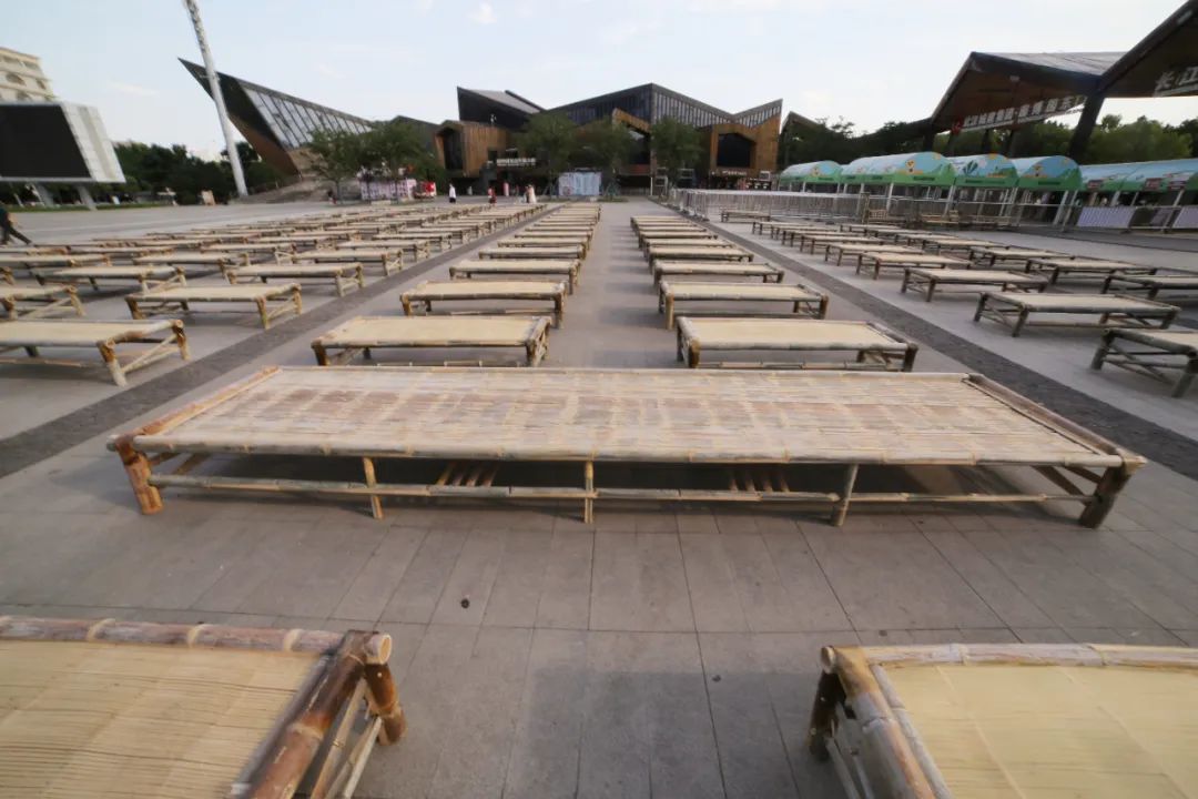 密密麻麻的竹床一个挨一个,大家躺在竹床上,渡过一个又一个的夜晚,形成武汉特有的竹床阵。