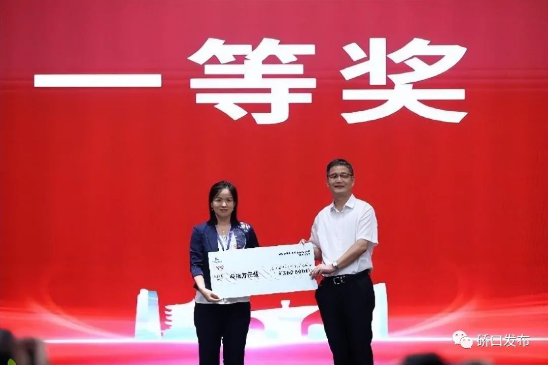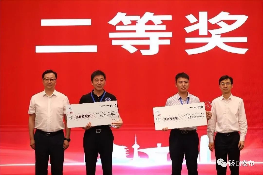 ▲武汉市科技局党组书记、局长盛继亮为一等奖获得者(左)颁奖