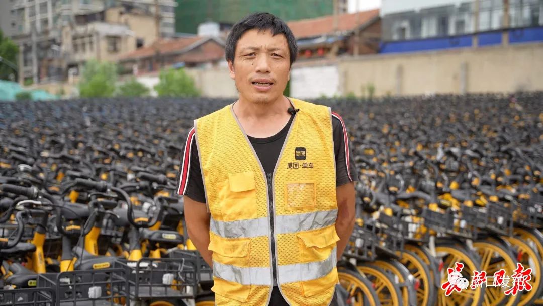 六角亭街道共享单车中转站正在摆放单车的工作人员吴立新今年48岁,他家住荣东社区,失业后一直待业在家,今年6月初他在社区参加了硚口城管局和六角亭街道联合组织的招聘会后重新上岗。“以前看到附近单车乱停乱放,现在我自己把它管好了,心里舒服多了。”吴立新说。