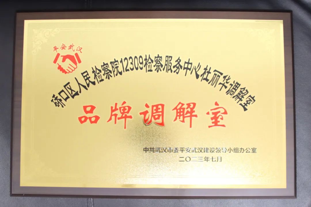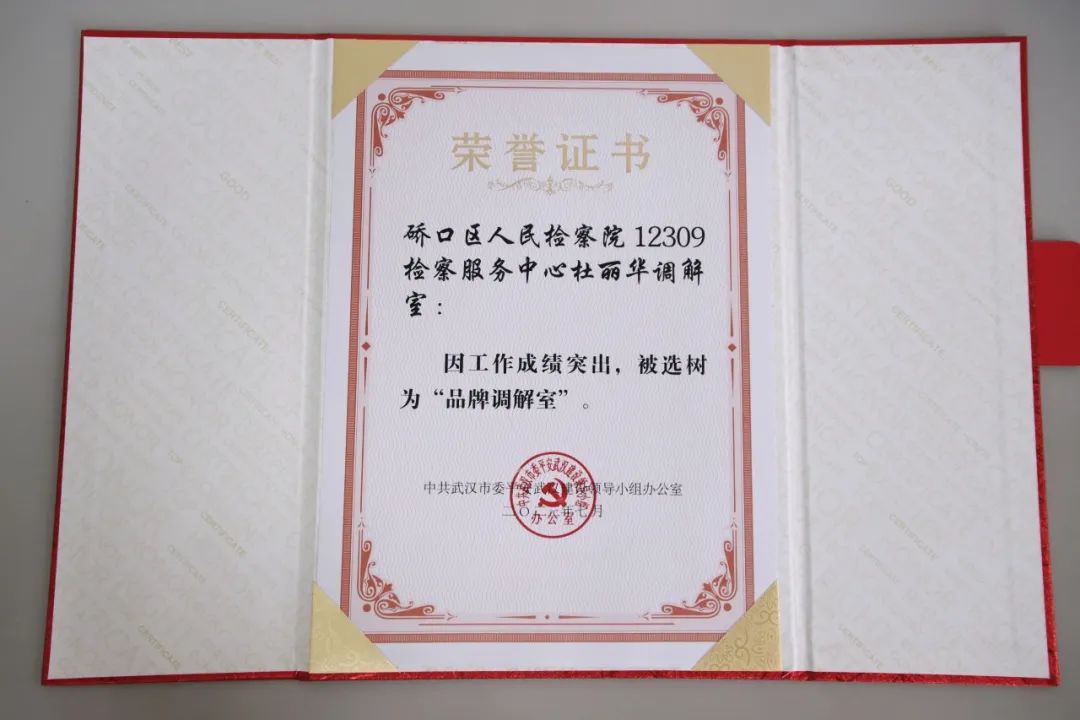 7月14日下午,在武汉会议中心,武汉市委平安建设领导小组对全市选树的100个“品牌调解室”和100名“金牌调解员”授牌,硚口区人民检察院12309检察服务中心杜丽华调解室荣获“品牌调解室”。