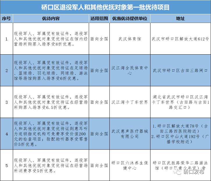 今年以来,硚口区大力推进优待项目拓展工作,在“八一”前夕,硚口区举行首批“拥军联盟商户”授牌仪式。为广大退役军人送上“八一优待大礼包”。首批签约的5家拥军企业包括武汉体育馆、汉江湾全民健身中心、汉江湾卡丁车世界、武汉惠声医疗器械有限公司、硚口区六沐养生保健中心,分别为军人军属、退役军人和其他优抚对象消费提供5-8折的优惠折扣。