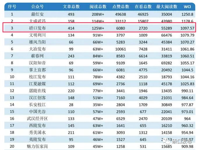 “ 硚口发布”以阅读总数第二