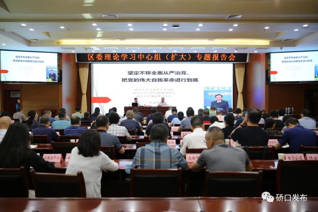 8月23日上午,硚口区举行区委理论学习中心组(扩大)专题报告会,深入学习贯彻习近平总书记关于党的建设的重要思想、关于党的自我革命战略思想和关于全面从严治党的重要论述,邀请武汉大学马克思主义学院二级教授李斌雄作“坚定不移全面从严治党,把党的伟大自我革命进行到底”专题辅导报告。