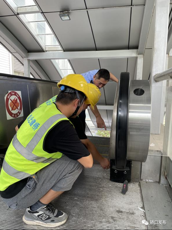 硚口城管道路桥梁养护队对同济健康天桥的扶手电梯进行清洁、润滑、调整等维护工作,筑牢行人出行安全线。