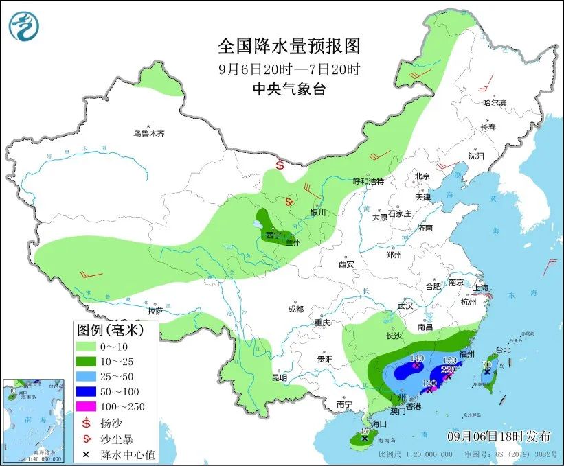 9月6日20时至7日20时,青海东部、湖南南部、江西南部、福建大部、广东中东部、海南岛大部、台湾岛等地部分地区有中到大雨,其中,江西南部、福建东南部、广东东南部沿海和北部等地局地有暴雨或大暴雨。