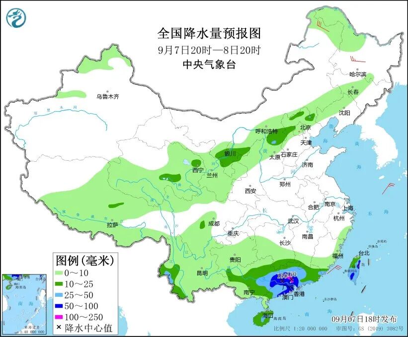 9月7日20时至8日20时,宁夏、山西北部、云南西南部、广东、广西、台湾岛等地部分地区有中到大雨,其中,广西东部、广东中部和南部沿海等地部分地区有暴雨或大暴雨。